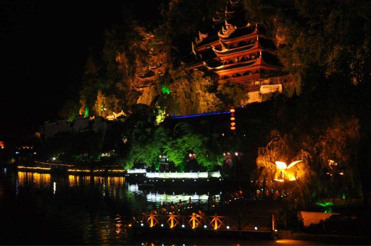 祝圣桥是古镇的地标,桥上有一座三层的亭子,这里曾是湘黔联通的主要通道,自古既有“湘黔咽喉”之称。每天晚上,祝圣桥上灯火通明,河水倒映着灯火,颇为壮观,无论是桥上闲逛还是拍照休闲都很适宜。祝圣桥头东侧是玉屏山,40多座明清古建筑依山而建,层层叠叠,颇为壮观。这是镇远古镇不可错过的一个地方:青龙洞。这些古建筑依山势而建,与悬崖、古树、藤萝、溶洞融为一体,浑然天成。穿行期间,有回到古代的感觉。最顶部的玉皇阁的镇远古镇的最高点,这里也是拍摄古城全景的最佳位置。从祝圣桥走一圈下来,差不多要一小时。青龙洞单独售票,门票60元。