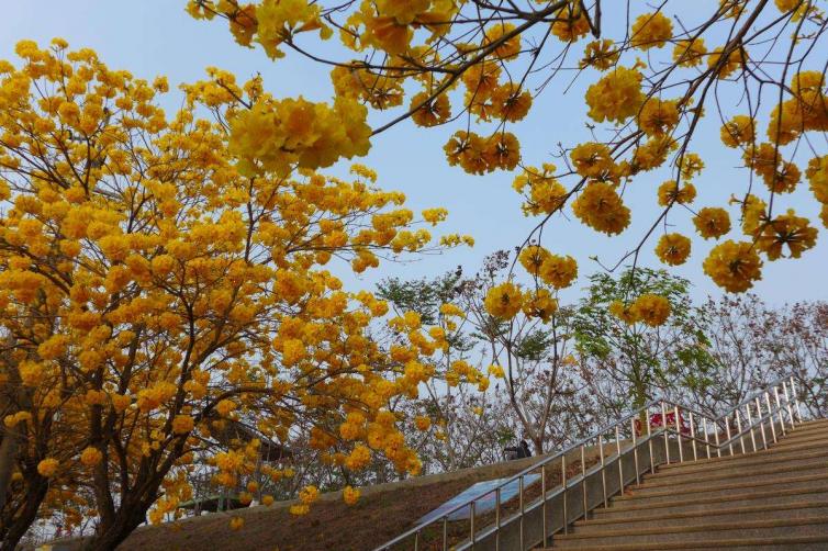 黄花风铃木:每年3、4月开花,开花时只见花而不见叶,花期仅十余天。黄花风铃木以不同风貌渲染四季:春天枝稀叶疏,倾情绽放美丽的花朵;夏天生叶结出果荚;秋天枝叶繁茂,一片绿油油的景象;冬天则落尽叶子,呈现凄凉之美。