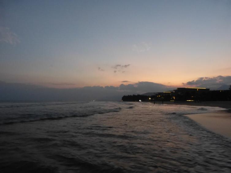 大东海旅游区位于三亚市区东面约二公里处,在鹿回头和榆林港之间,是个长约2公里的月牙形海湾。它背靠青山,东南平行走向的两条小小的山脉,恰似两道巨岩筑成的屏障环抱着海湾。长达千米的洁白沙滩边围,一排排高大耸翠的椰树擎着巨型绿伞给海滩遮阳。辽阔的海面晶莹如镜,只见白沙融融,阳光、碧水、沙滩、绿树构成了一幅美丽的热带风光图画。这里,没有刺骨的寒流,没有连绵的阴雨,四季如春,常年朝霞撒玉,丽日铺银,夕照流金。即使是北国滴水成冰的冬日,这里平均水温也18‘C-- 22’C。由于大东海的碧水、白沙、青山、绿椰、阳光均属大自然所赐,故人们称它“天然浴场”。“水暖沙白滩平”早已使大东海成为蜚声海内外的冬泳避寒胜地。