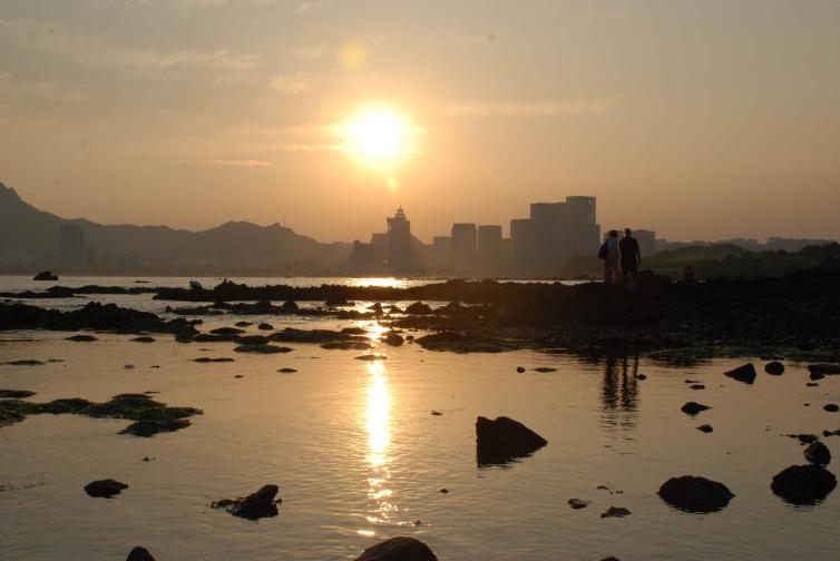 石老人海水浴场,左端海中巨石即为“石老人”,是集度假、观光旅游、海上运动、沙滩运动、休闲娱乐为一体的综合性旅游度假海滩。