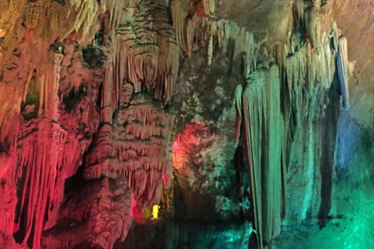 是典型的喀斯特地貌溶洞。洞内自然形成若干大厅和侧厅。在五光十色、变幻无穷的奇峰异石之中,4根大石柱直抵洞顶,每根石柱都在20米高以上,柱上石花丛生,如雕龙刻凤,色泽艳丽。