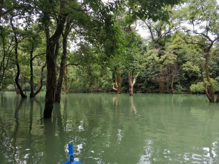 鸳鸯湖是由两个大湖——鸳湖和鸯湖,及四个小湖串联组成的一个奇妙水网,最深的地方38米,繁茂的树木藤蔓,在湖水中肆意生长,水鸟在眼前轻轻划过,阳光在缝隙中穿透,满眼的翠绿,境界幽绝,令人心醉。