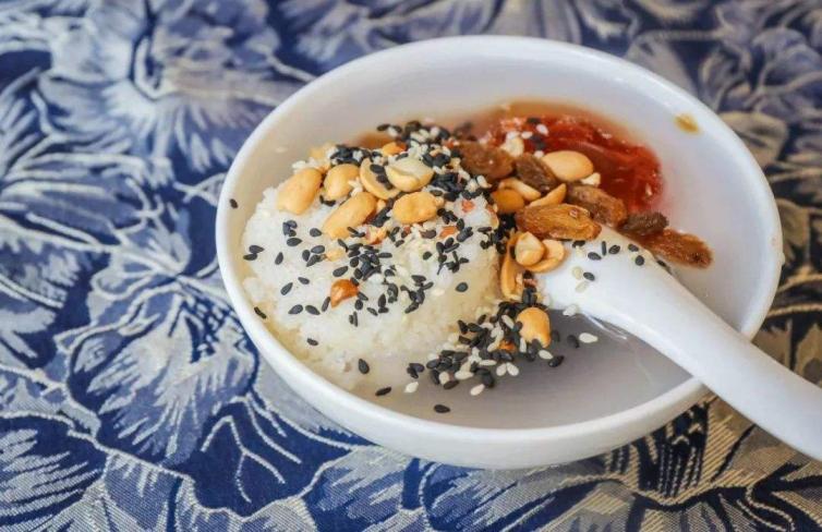 油炸粑稀饭先将米面搅熟成糊状,盛入碗中,再从滚油中将炸得黄脆的糯料豆沙粑捞起放进去,然后舀上一勺黔中特产“引子”,浇上一瓢滚油便可。油而不腻,内酥外软,十分可口。