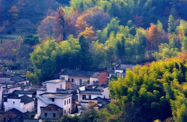 塔川:红叶翻飞醉金秋;塔川村口及周围地带多植乌桕树,且古树参天,每到秋季,满山树叶色彩斑斓,粉墙黛瓦掩映其中,美不胜收。