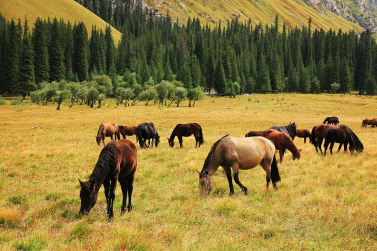 昭苏:在天山山脉之间,纯白巍峨的雪山下即是红得惊艳的树木,不像胡杨林那样壮观辽阔,但红叶黄林与河边喝水的牛羊点缀着整片渐渐泛黄的草原,都足已让你流连忘返。