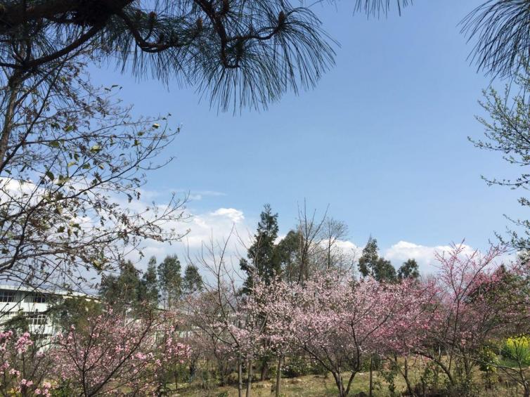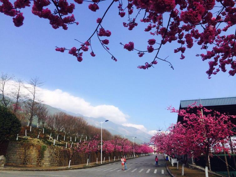大理学院的古城校区位于大理古城西面苍山脚下,背靠苍山,面朝洱海。每到春夏,学校内几千株株樱花桃花盛开,一片春红。
