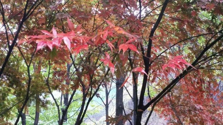 行走在这里,你会觉得步子都变得轻快,特别是夕阳西沉的时候,看看眼前延绵不绝的红绿,再微眯着眼睛,抬头感受阳光透过红叶落下的零星温度,别提有多醉人。