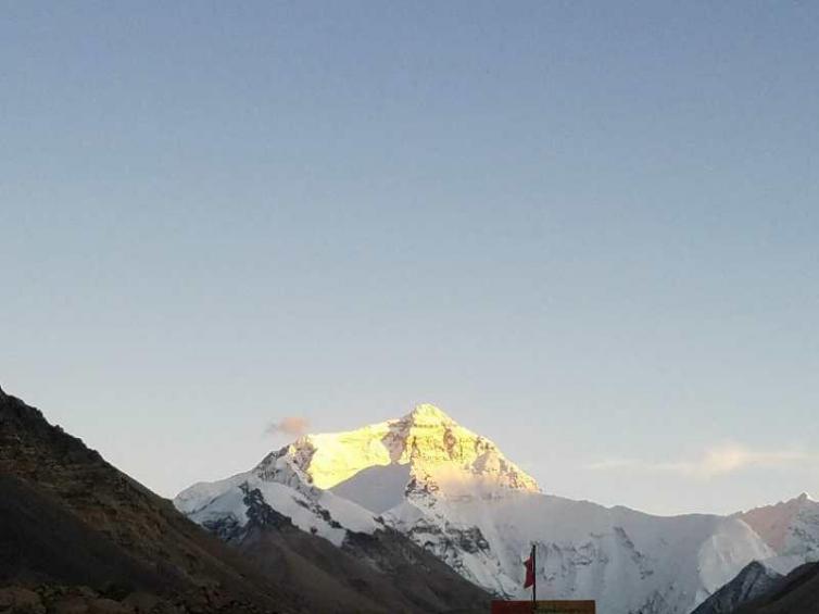 远远观看珠峰山体,地形陡峭高峻,山峰上部终年为冰雪覆盖,呈令人震慑的金字塔状。所以,如去西藏不观珠峰不能不说是一件憾事。