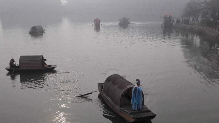 宋朝百姓在其间,歌舞杂技从中现,迎亲队伍从中穿,唢呐鞭炮声入耳,热闹非凡。