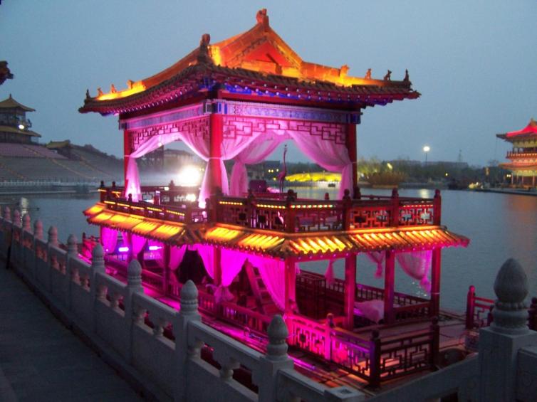 走进大门,绕过一座前有张择端站像、后有清明上河图传奇故事浮雕的影壁,便是公园的主题广场。广场中央的池水中浮动着一只造型古朴的宋代木船,船上桅杆高耸,云帆高挂,象征着宋代繁忙的漕运和高超的造船技术。