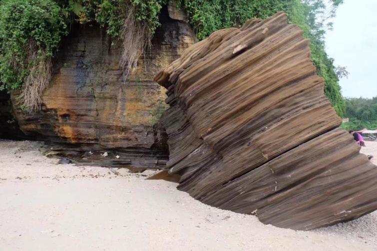 滴水丹屏位于涠洲岛滴水村南岸边,原名滴水岩。绝壁上部绿树成荫,壁上层间裂隙常有水溢出,一点点往下滴,如朱帘垂挂。滴水丹屏是赏日落的最佳位置。晴天的傍晚时分,落日的余辉与红色的岩石相映,恍若走进电影镜头下的画面。