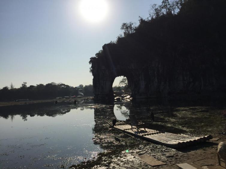 象鼻山四绝,其一是形若巨象。其二是水月奇景。象鼻与象腿间有一通透石洞,宛如皓月临水,空灵通透,清澈的漓江和桃花江穿鼻而过,构成“象山水月”奇景。其三是洞中三花。象山的腹部为藏酒岩洞,因其适宜的温度和独特的地理位置,为酿酒提供了得天独厚的条件。