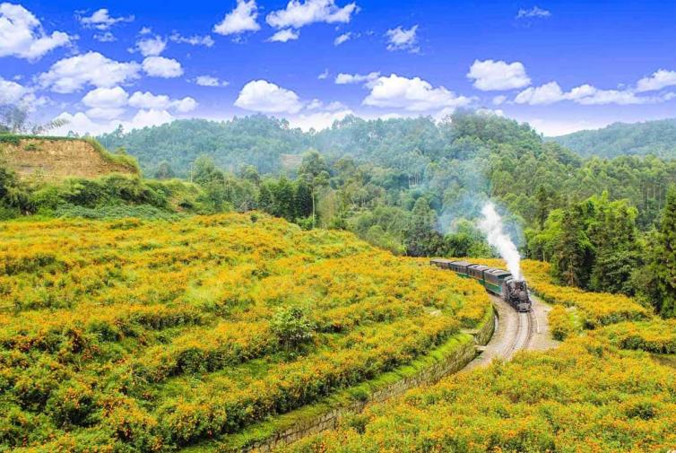 四川乐山市犍为县大山深处的嘉阳矿区,每天都能听到“呜---呜----”的汽笛声,一列古老蒸汽小火车,用它特有的方式显示着自己的存在:蒸汽式动力、窄窄的铁轨,满是煤灰的司炉、每小时只能跑20公里以及全手工操作,岁月仿佛回溯到了18世纪。在春天油菜花开的时节,小火车突突喷着白色蒸汽分拂花田而来,如童话般的景色就展现在你眼前。