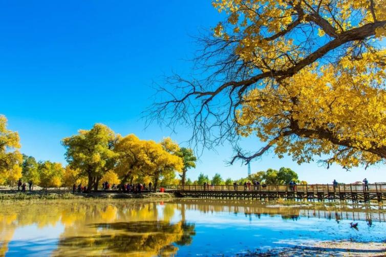 胡杨林景区以额济纳河上的八道桥为名划分,分为一至八道桥。这里有一片辽阔无垠的草原和沙漠,天高气爽,大漠金沙,据说还曾是电影《英雄》的外景地呢~