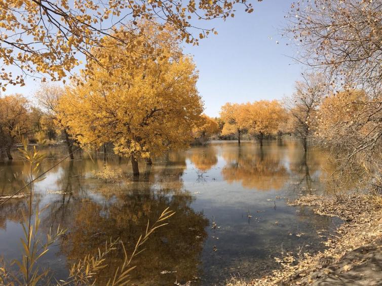位于甘肃省酒泉市金塔县城以西的潮湖林场,为三北防护林体系的一部分。这里有着上万亩胡杨林,金秋十月的胡杨,绿色的树叶有的已经变黄,已经变黄的胡杨树,在湛蓝的天空下,在荒芜的沙漠中如阳光一般明媚灿烂。