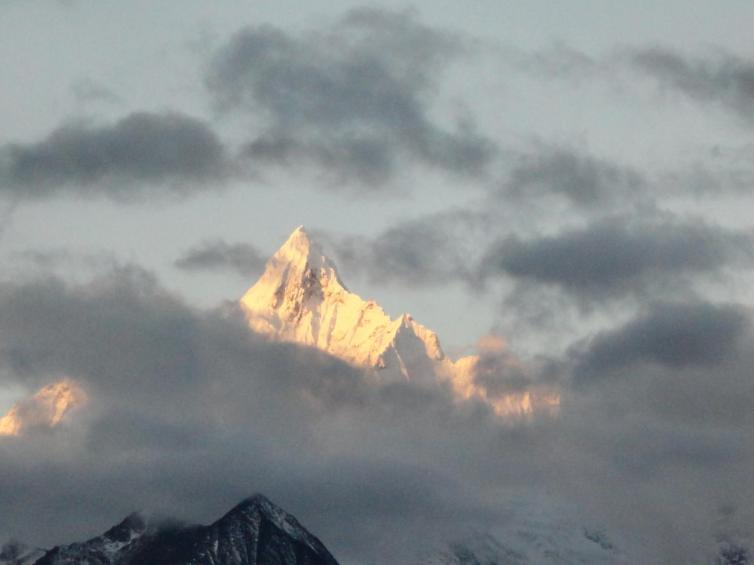梅里雪山又称雪山太子,当地藏民视为“神山”,位于德钦县东北约10公里的横断山脉中段怒江与澜沧江之间,北连西藏阿冬格尼山,南与碧罗雪山相接,平均海拔在6000米以上的有13座山峰,称为“太子十三峰”,主峰卡格博峰海拔高达6740米,是云南的第一高峰。
