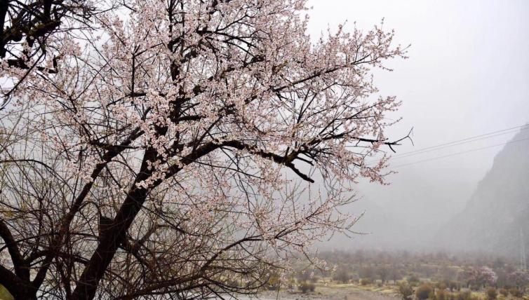 三月,寒气还未消尽,在皑皑的雪山之下就有了一片桃红的存在,映衬的天地间格外的柔媚。