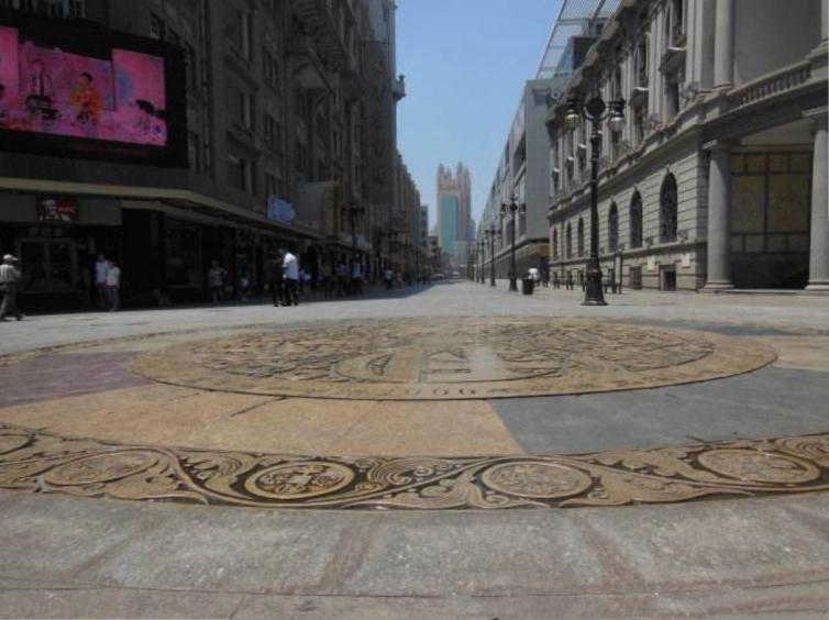 就着吃完小吃街上的美味,就在顺着滨江道溜达溜达吧。天津滨江道我不说,估计大家也知道多有名气,就这个机会,给大家说说不一样的吧,“金街大铜钱”。顺着滨江道往和平路的方向走,步行10分钟左右,就能看见在一个很大的铜钱镶嵌在地面上。要说这个铜钱,那来历也不小,它是国内目前埋地型铜钱浮雕之最。来过大铜钱的朋友都知道,站在大铜钱上面对着圣奥体育楼外的LED大灯,还能看见自己的影像哦,想看自己上屏幕,其实就这么简单,哈哈。