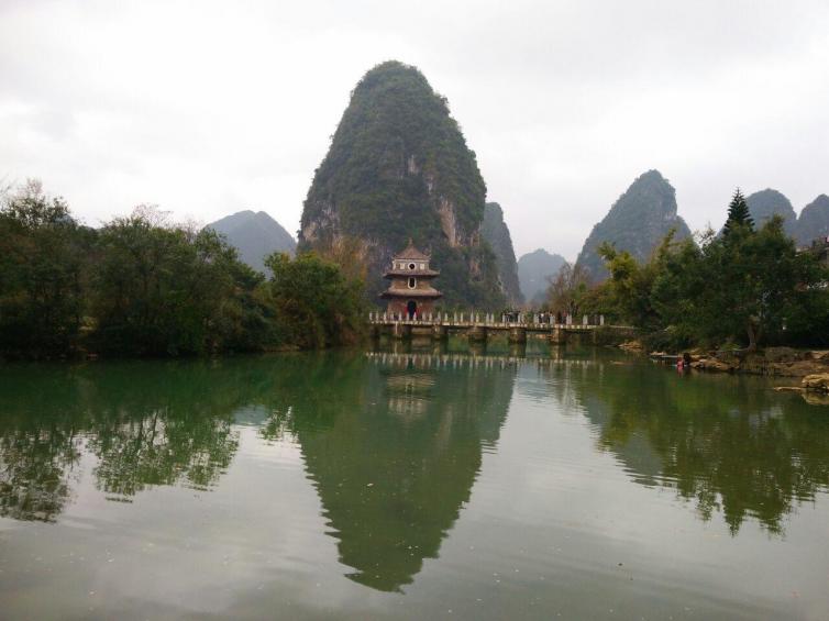 鹅泉,靖西有八景,其中一景“鹅泉跃鲤三层浪”,说的便是鹅泉中鲤鱼听人呼喊便跃出水面的奇观。鹅泉水面宽阔而澄澈,像明镜一样,将周围的山峦、泉边的绿树和木桥、亭子悉数倒映在水面上。而水上游过的三两水鹅,又泛起层层涟漪,将明镜揉碎成荡漾的碧波。