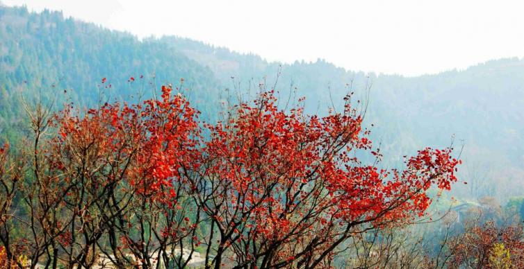 红叶谷风景区以野生的灌木丛黄栌为主,是红叶谷独有的观赏树种。红叶谷海拔500米左右,平均气温比市区低5摄氏度左右,山地小气候较为明显,景区的植被覆盖率达97%,空气中负氧离子的含量是市区的300多倍,是一处“天然氧吧”,故称红叶谷是“泉的源头、云的故乡、花的世界、林的海洋、休闲度假的天堂”。