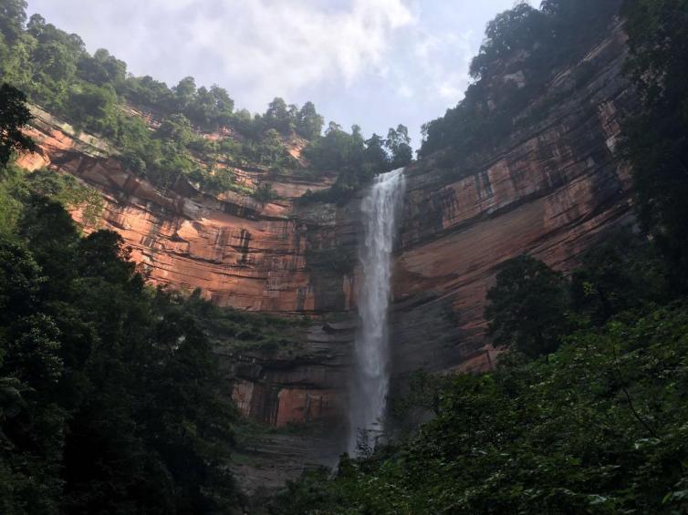 午后阳光照射下,佛光岩丹霞似火, 血红的岩壁与雪白的瀑水相互融合,此时白云弥漫,圆光五色现其中,如佛光普照,赋予赤壁灵动的活力。