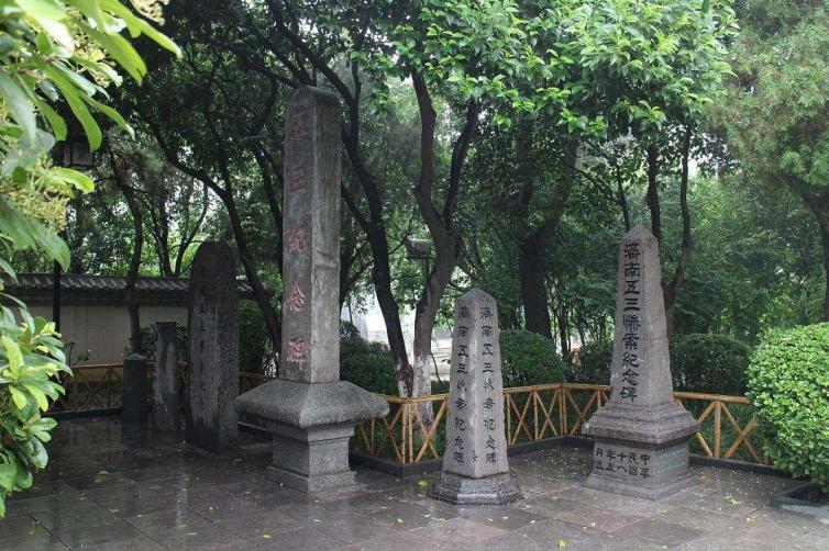 “济南惨案纪念堂”位于趵突泉东北角,迎面就是一座汉白玉牌坊,横额上书“后事师表”。两尊石虎镇守牌坊左右。这是根据汉代造像设计雕刻的,既吉祥威严又有历史厚重感。