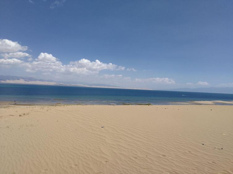 金沙湾恰似一个新月型沙丘漂浮在水面上,它与湖东岸连绵起伏的沙山,构成青海湖区独特的沙漠景观,与蓝天、碧水、黄沙混为一体。