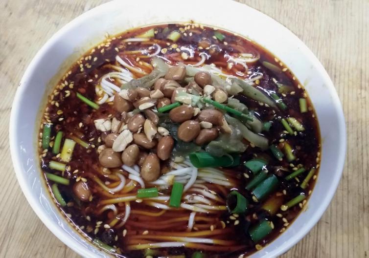 酸辣粉满满一碗,粉条筋斗爽滑,香葱、香菜、花生碎、辣椒、醋、肉酱保证丰富口感,巴适啊。