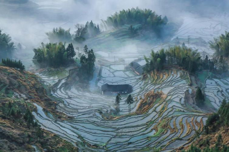去紫鹊界,要顺着车道开往山上。站在高高的观景台上,那端庄秀气的梯田就在面前蔓延开来:朦胧的细雨让四周的高山幻化成一幅水墨山水背景画,梯田中间那些时不时冒出来的农家小屋,在飘渺的雨雾中若隐若现。远远俯视,蓄满了水的梯田亮晶晶,星罗棋布。