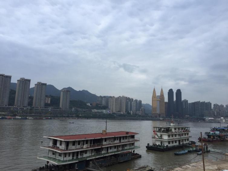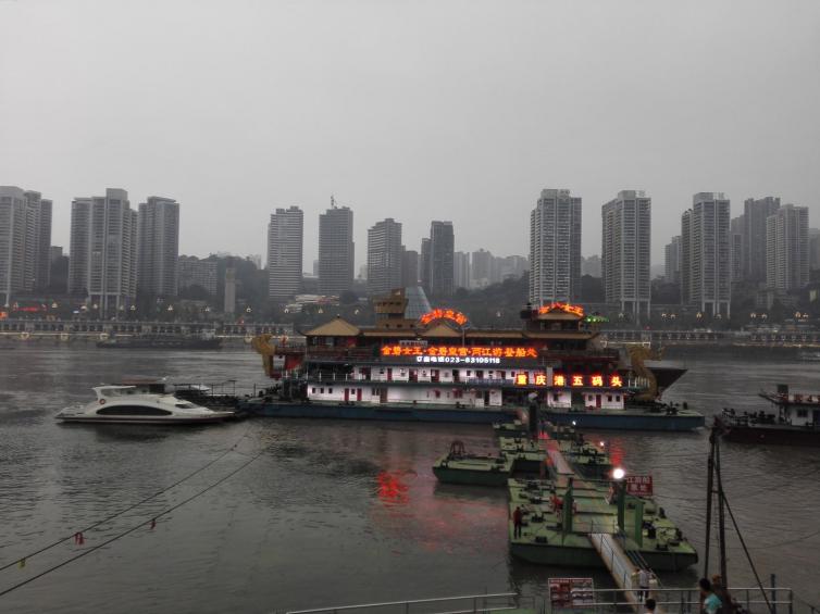朝天门广场就修建在码头的上面,远看朝天门广场就象一艘扬帆远航的巨轮,气势磅礴,因此朝天门广场也被称为重庆的泰坦尼克号。站在广场上,可以看到两江交汇,黄色的长江水与碧绿的嘉陵江水在交汇处泾渭分明,形成了一道独特的景观。