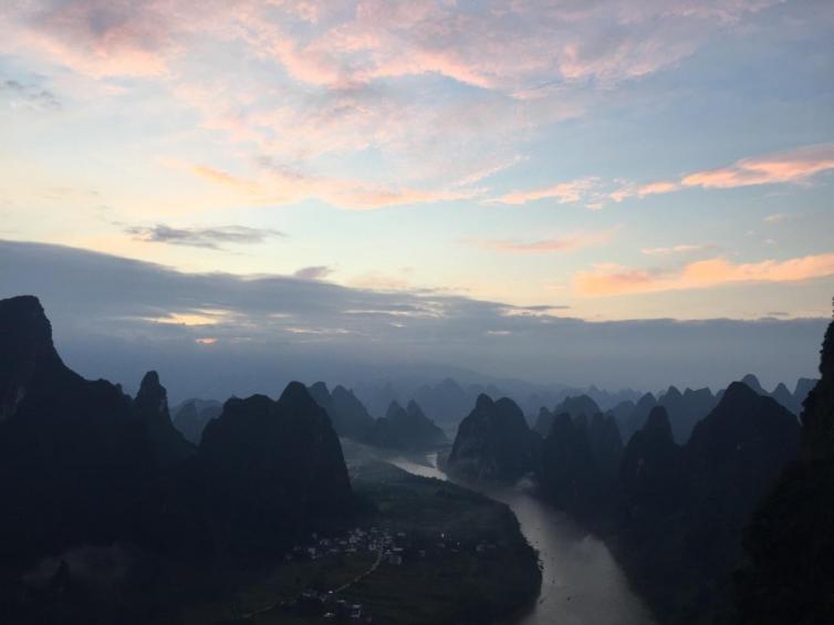 2、俯瞰漓江第一弯—相公山。相公山位于阳朔兴坪镇内,处在漓江著名景点“黄布倒影”与“九马画山”之间。绝佳的天然地理位置使得相公山上视野极为开阔,登上山顶可以一览无余漓江最精华的部分。而这里同时也是观云海、赏日出日落的最佳观景地点。相公山目前并不属于正式景区,因此不会有旅行团来到这里,也造成了这里成为了一个小众景点。