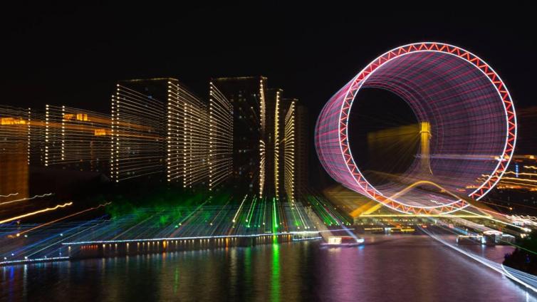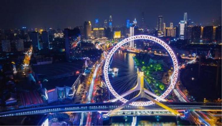 天津之眼(TheTientsin Eye),全称天津永乐桥摩天轮(The Yongle Bridge TientsinEye),坐落在天津海河畔,是一座跨河建设、桥轮合一的摩天轮,兼具观光和交通功用。是世界上唯一建在桥上的摩天轮,是天津的地标之一。摩天轮直径为110米,轮外装挂64个360度透明座舱,每个座舱可乘坐8个人,可同时供512个人观光。摩天轮旋转一周所需时间为30分钟,到达最高处时,周边景色一览无余,甚至能看到方圆40公里以内的景致,因此被誉为“天津之眼”。