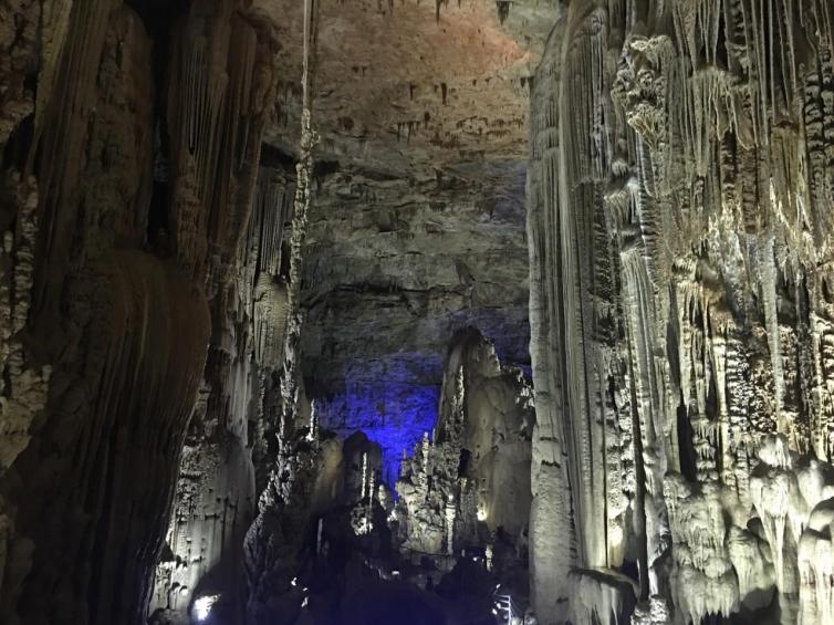 洞内钟乳石造型各异,有的像人、有的像物让人浮想联翩,它们都有自己的名字霸王金盔、普度众生、倒挂琵琶、姐妹玉树……造型各异的钟乳石,在各色灯光的照耀下,气象万千,让人分不清是现实,还是梦境。