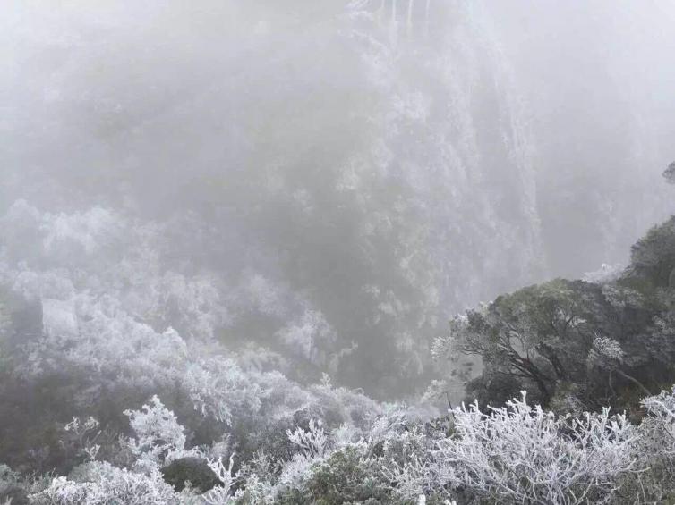 湖南省衡阳市南岳衡山景区,素有“神州最南赏雪佳处”的美誉,因山顶处横风缘故,南天门至山顶南侧未形成雾凇现象,北侧却雾凇成片。
