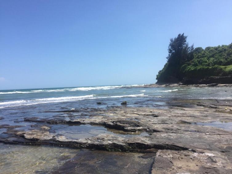 滴水丹屏位于涠洲岛滴水村南岸边,原名滴水岩。绝壁上部绿树成荫,壁上层间裂隙常有水溢出,一点点往下滴,如朱帘垂挂。由于海蚀作用,岩石的外表形态犹如一有眼、有鼻、有嘴、有发的巨型侧面“人头像”(现已倒塌),景致优美。