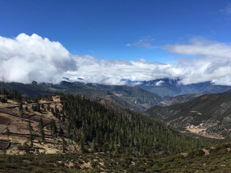 告别草原,翻越横断山最大的天险——业拉山(又名怒江山)。山口海拔4839米,一路蜿蜒地下坡到了怒江七十二拐。路越来越窄,路面比较颠簸。玉曲迤逦而来,极尽舒缓。远处雪山连绵不尽,直至天边。在山的凹陷处,靠近河边,依稀可见藏族村落。沿途雪山、原始森林和田园风光交相辉映。