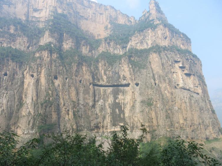 这是一条长约一千多米、成“之”字型的挂壁公路,穿行西流河峡谷之中。抬头仰望,路的一侧是一百多米高的悬崖峭壁,刀削般的地耸入云天,令人生畏。挂壁公路的对面林壑优美,怪石嶙峋,崖壁上林木葱茏,险峻壮美。相较南太行挂壁公路,这条挂壁公路没有开凿“窗户”,要么是完全袒露在外面,要么是黑乎乎的隧道。
