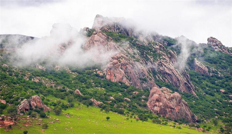 巨龙似的山体周围广泛分布的侏罗纪地层和白垩纪地层。那些代表着侏罗纪、白垩纪等不同地质年代的绿色、紫红色、褐色、黄色、朱红色、棕紫色等砂岩地层色性特征,使陡峭的山崖色彩斑斓。