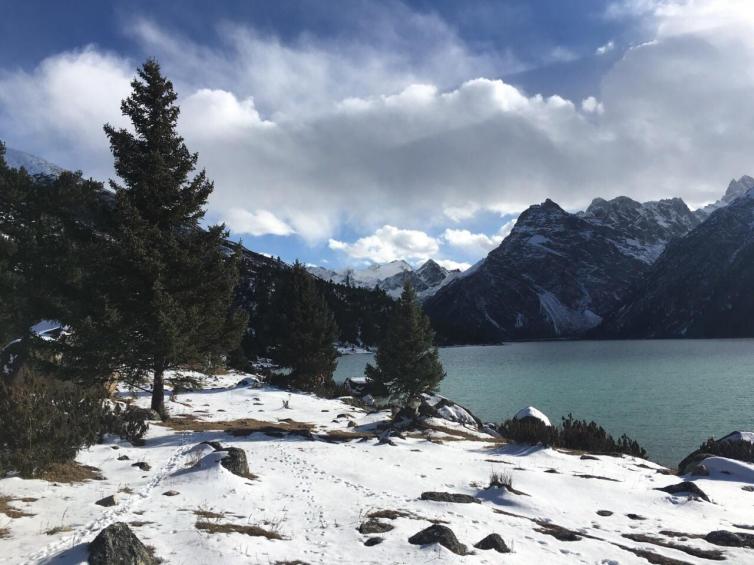 新路海海拔4040米,是甘孜州著名的冰蚀湖。水源由雀儿山冰川和积雪消融供给,湖尾流出的溪流为措曲河源头之一。新路海的水呈现牛奶蓝色,湖中许多玛尼石,在雀儿山下,熠熠生辉。新路海也是白唇鹿自然保护区,湖边可露营。
