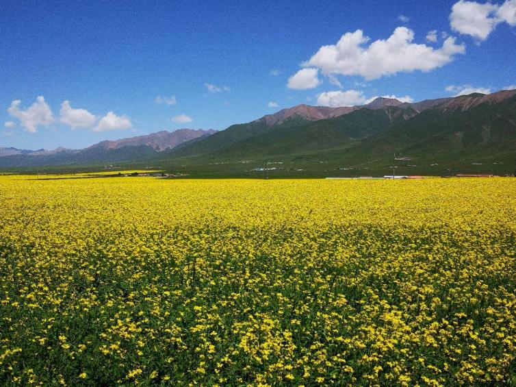 七月中旬,门源的油菜花竞相怒放,北依祁连山,西起永安城,东到玉隆滩,南邻大坂山,绵延数百公里,气势壮观铺天盖地,无边无际肆意盛放。在高原深蓝的天空下,一望无垠的金黄异常斑斓,与远山近水,村落人家相辉映,近看远观皆为美景。