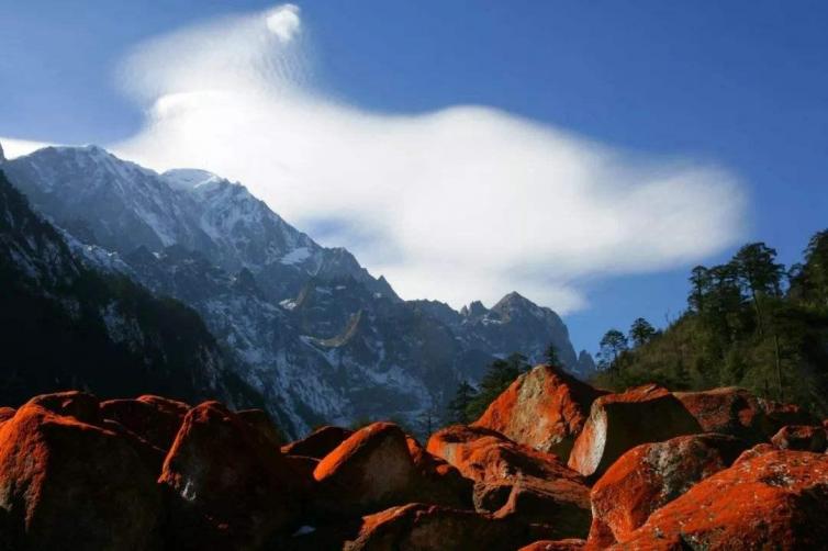 红石滩是燕子沟最靓丽的风景,特别是雪后,纯净的白铺在茫茫一片红石海上格外漂亮。这种红色藻类只生长在高海拔空气干净的地方,同时也是检测空气环境的自然指标,徒步看雪山相当巴适。