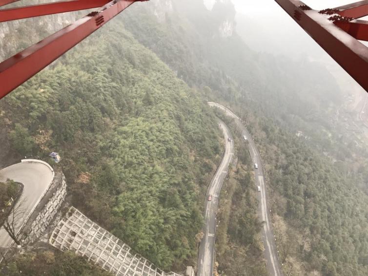 矮寨特大悬索桥是国家重点规划的8条高速公路之一——长沙至重庆通道湖南段吉(首)茶(峒)高速公路中的重点工程。工程为双层公路、观光通道两用桥梁,四车道高速公路特大桥。桥型方案为钢桁加劲梁单跨悬索桥,全长1073.65m,悬索桥的主跨为1176m,创造了四项世界第一。(好恐怖!下面就是万丈深渊!宝宝恐高症要犯了!)