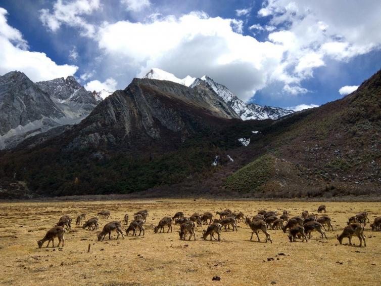 附近藏民放牧的牧场,收获属于当地人生活气息。背靠三座神山(仙乃日、央迈勇、夏诺多吉),是观赏三座山的最佳地点。