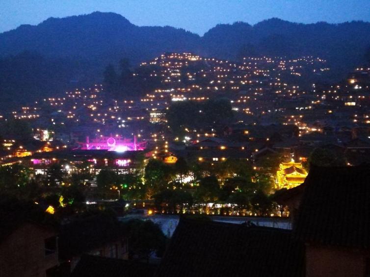 山坡上层层叠叠苗家木质吊脚楼,咖啡色的老房子依着碧绿的群山,鳞次栉比,蔚为壮观。等候夜幕降临,千百盏灯火从木质吊脚楼的屋檐下亮起,星星点点,勾勒出整个苗寨的轮廓,四处都是灯火通明,令人震撼。