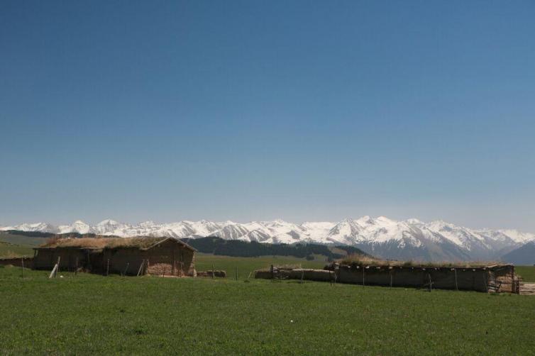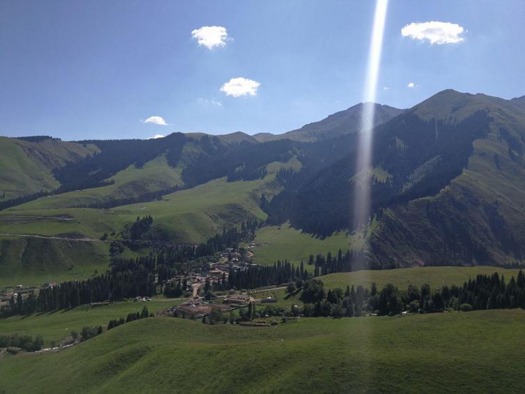 草原处处是画卷,远处,雄伟的天山支脉披着绿色的戎装,山下的丘陵上,马群、羊群在风中游荡、觅食。越往山里走,松林也越来越多。蓝天白云映衬着散发出泥土气息的青草,沿途的风景随着车子的移动随时变换着美丽的景致。