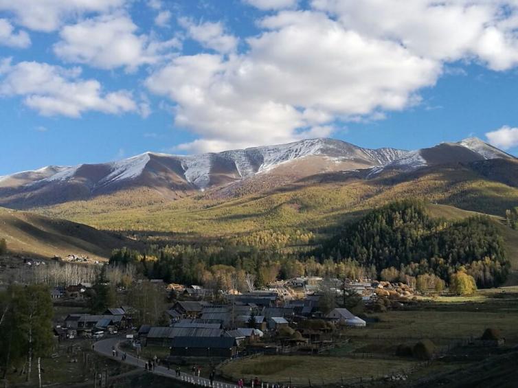 阿尔泰山上金黄色的松树林一直延伸到白哈巴村里,村民住的木屋和圈养牲畜的栅栏错落有致地散布在松林和桦林之中,安宁、祥和。随意点缀在村中木屋栏栅旁的白桦树,或金黄或翠绿,与木屋、炊烟、挑水的村妇、牧羊的孩童一起,营造着家园的温馨。