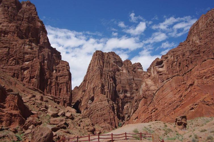 天山神秘大峡谷又叫克孜利亚大峡谷,维吾尔语意是“红色的山崖”,这是因为大峡谷由红褐色的巨型山体群组成。天山神秘大峡谷红褐色的山体群直插云天,在阳光照射下,犹如一簇簇燃烧的火焰。进入谷内,在红褐色的山峦中步行,仿佛进入了一个幽静清凉的世界。