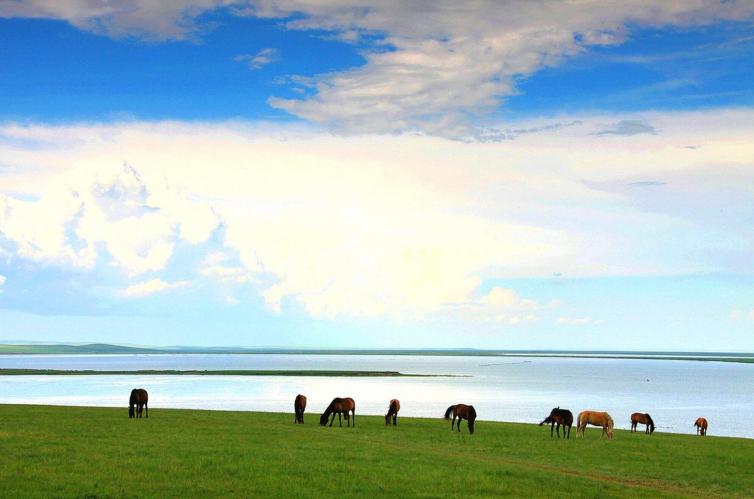 呼和诺尔湖意为“青色的湖”,夏季草原上绿草如茵,这里碧绿的湖水就像镶嵌在草原上的明珠,湖边洁白的蒙古包、可爱的骆驼、草原上的羊群和马群休闲的吃着丰美的水草,湖水跟天空连成一线,在蓝天白云的衬托下,像极了一幅美丽的水墨画一样。