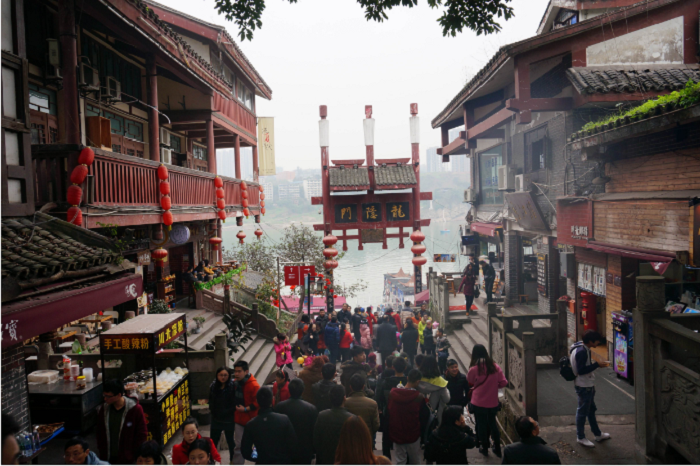 洪崖洞靠嘉陵江边,由于独特的吊脚楼建筑,吸引了无数旅游爱好者前来观光。洪崖洞里有一层美食街,各种各样的重庆特色小吃以及台湾小吃,应有尽有。