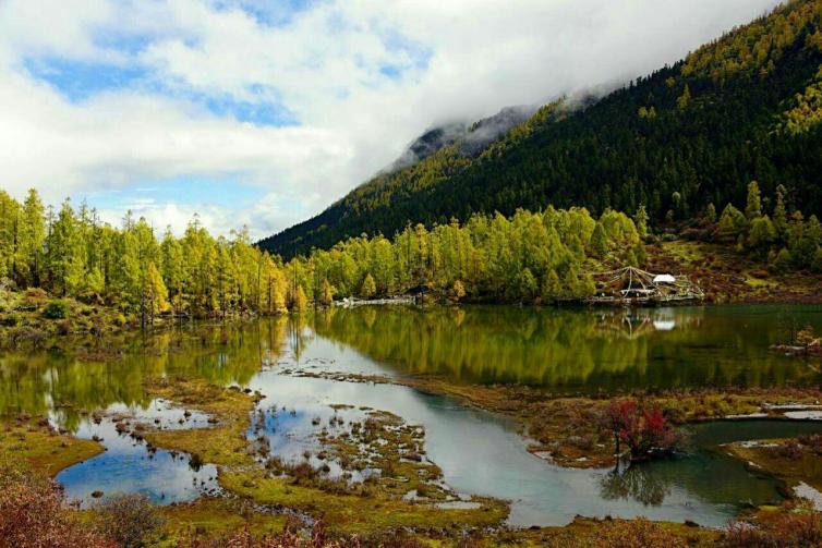冕宁县冶勒乡,湖水清澈如明镜,山体被云雾缠绕,湖畔屋舍幢幢,远远地还传来狗吠。坐在湖边吹风拍照、烧烤露营,都非常巴适。